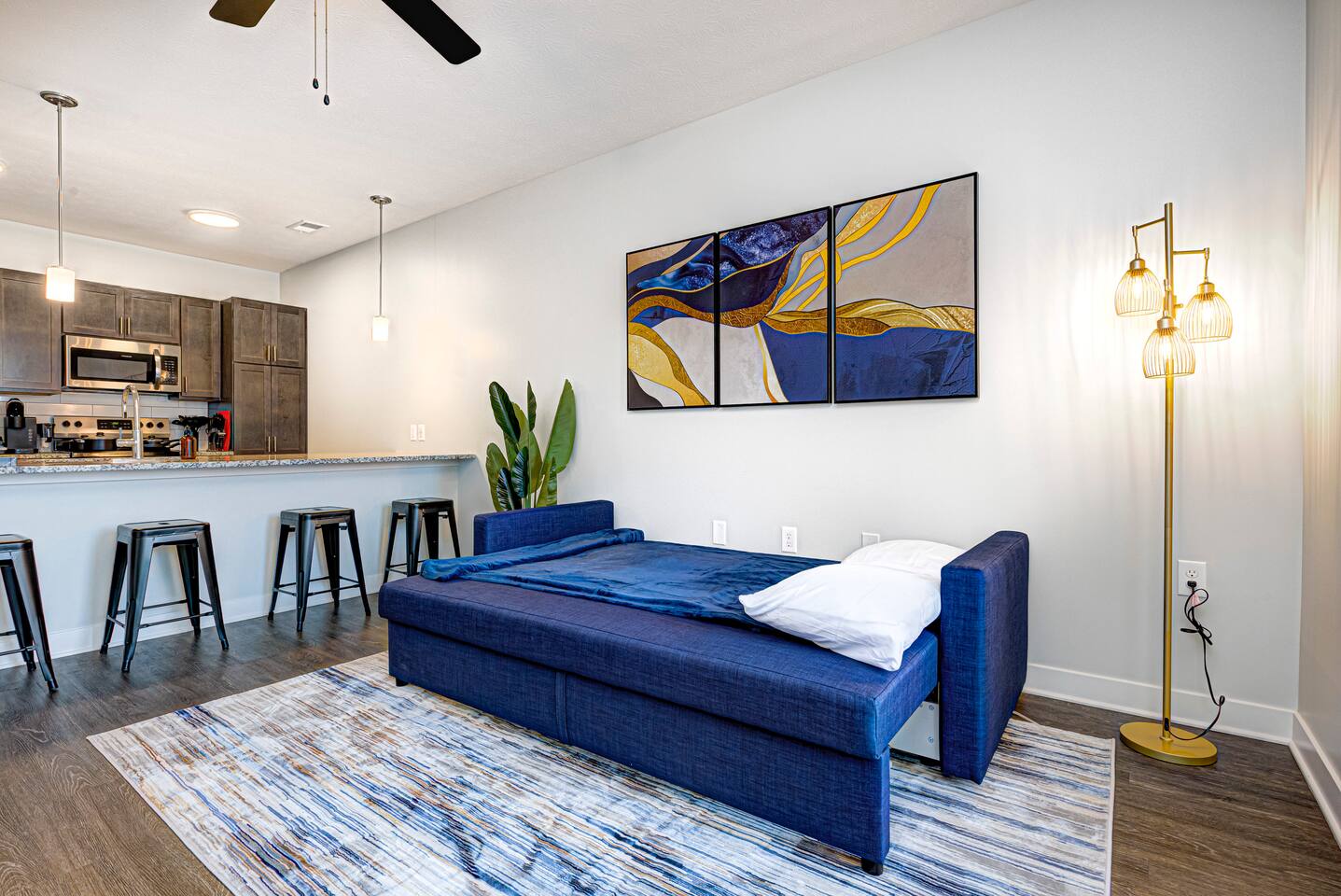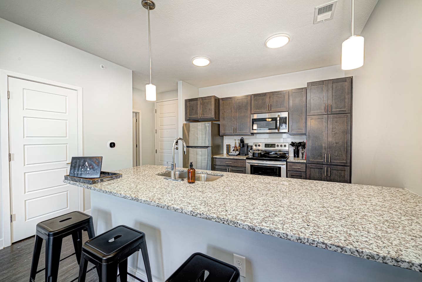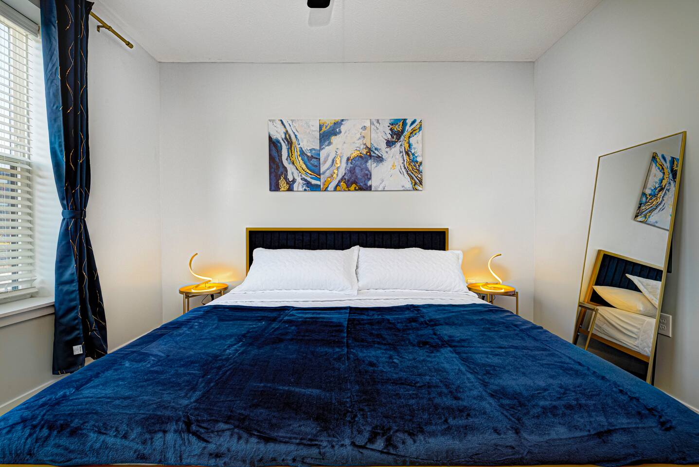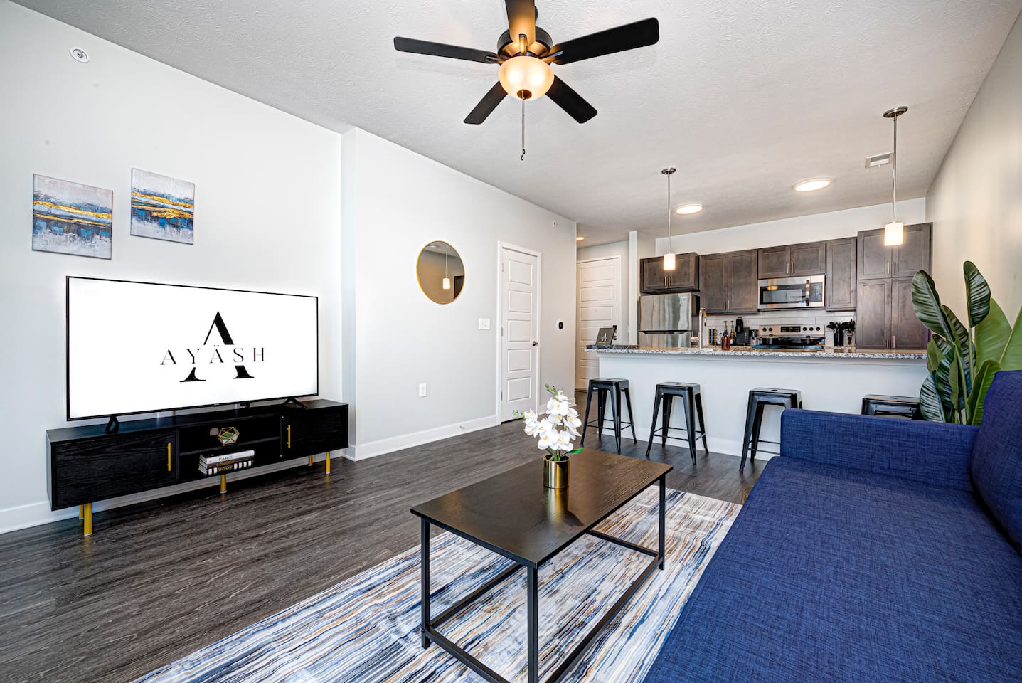 Welcome to Ayash's newest suite in Downtown Indianapolis. Located downtown, only 5 minutes from the nightlife of Mass Ave, and less than 10 minutes to IU Health Methodist, Riley, and Eshkenazi hospitals. A king bed, fully stocked kitchen, dedicated workstation, 24/7 gym access, and a beautiful city view balcony await you in this suite. *Medical professional discounts available for long-term stays*